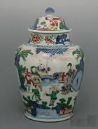 紅緑彩も五彩の一種と考える人がいますので、金元明の紅緑彩を参照。 元の時代に色絵の色が増えた上に、釉下彩と併用の技法もあったので、それは”元五彩”と呼ぶ。 明代万 歴以降、景徳鎮を中心として盛んになり、嘉靖期にはすでに金彩を加えた金襴手なども登場した。民窯でも多様な五彩が焼かれ、中国国内のみでなく多くの五彩が海外へ輸出される。 |