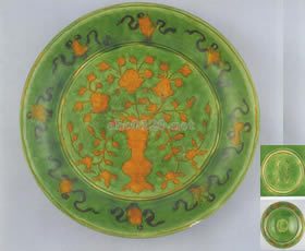 清早期(康熙~雍正)は素三彩の繁栄期であり、色彩は更に鮮明で、絵付けも上手、風格多彩。 康熙素三彩 ![]() ![]() 雍正 ![]() 明末清初、中国南方地方、台湾、安南地域で、色釉高温陶器を盛んでいた、色使いは緑、黄、茄、白など、景徳鎮の素三彩より色は濃い、光沢は強い。交趾焼とよばれています。(”交趾”とは安南地方を指すことです。) ![]() 明成化以降は官窯は闘彩器の生産へ写し、素三彩の生産は少なくなりました。 明後期~清早期に、色釉を分界するため、予め刻文するではなく、盛り上げた文様の境界を作り、素焼きした後空白の部分に色釉を掛けるという技法があった。それは、後来”法花”や”琺華”と呼ばれる品です。 ![]() |
