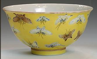 清の時代から、より繊細で明瞭な黄釉になります。黄釉器は皇族の特権とされています。(左写真参照)、その中鶏油のような厚実かつ落ち着いた感じの発色は最上品とされています。(非常に明るい黄色は写しの疑いがあります。) 清末から現代掛けて、軽い発色の黄釉も出た。 |