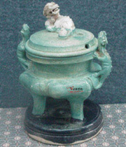 | 早期色釉として、漢の時代から多く焼かれました。以降歴代製品がありました。骨董価値のあるものは古陶時代のものだと思います(漢の時代~宋の時代まで、内唐三彩の一つの色釉としての緑釉器も価値が高い)。 漢の時代の緑釉は多く鉛の成分が含有し、現在発見されているものほぼ釉面には銀化膜帯びであります。 ![]() 近代発見されている漢緑釉器の中、キューカンバーグリーンとよばれるキュウイ皮のような光沢のよい深い緑色は人気上昇中です。割と銀化のすくないものは存在します。 |