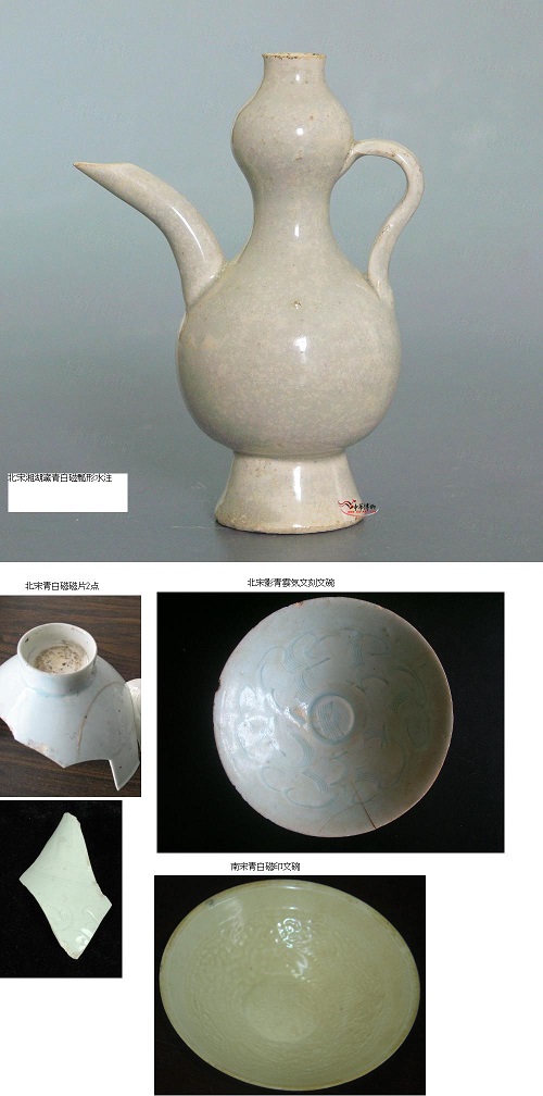 文献記載により、北宋期中国華南地域の景徳鎮あたり(伝湖田窯)が最初焼き始まった。当時の景徳鎮はそれほど大規模な窯群ではなく、宋の名窯に名を上げられない程度の民窯でした。元々白磁を作りつもりだと思われますが、水土の関係で、極軽い青色調を帯びた釉薬が作られた。器の凹み部分に溜まり込んだ厚い釉は青く影るように見えた。その”隠約”的な青色調と釉面の玉質感は中国の美文化の深い部分に触れたため、博大な人気が得た。![]() しかし、考古学的には北宋の時期の景徳鎮についてはまた未明な部分がたくさんあります。けれども、元の時代末期からの景徳鎮の影青釉の歴史は基本に明らかであります。現代まで焼き続いています。透明感は高め、色調は若干青緑になります。 ![]() 北宋、南宋青白磁、影青参考品 明の早期から、染付器の普及により景徳鎮の主流は影青から、白磁(卵白釉)へ譲りました。昔叶えなかった青磁の夢を追い続いた、それは、宋の青磁を写しながら、景徳鎮流の影青流のマナーも思う存分表現しました。例としては:浅い陰刻文に釉溜まる色変化を表現する。 景徳鎮青白磁標本 |