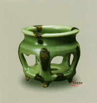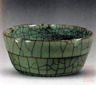 窯元は哥窯から名前をえった。南宋官窯のような「紫口鉄足」現象があります。南宋~元早期の作品は粉青、米黄、月白、油灰など呼ばれる色合いがあります。厚い釉にたくさんの荒い気泡が見られます。釉面の光沢はソフトで弱い、「酥光」と呼べれます。「金線鉄糸」と呼ばれる2色、2重氷裂磁貫入りの厚い青磁、その美術性の高さは公認されています 哥釉が存在した時期は非常に短期でしたので、遺品は極めてすくないので、台湾の故宮博物館に数点か収蔵されています。市場に出回る品はほとんど後代の写しだといわれます。 ![]() ![]() |