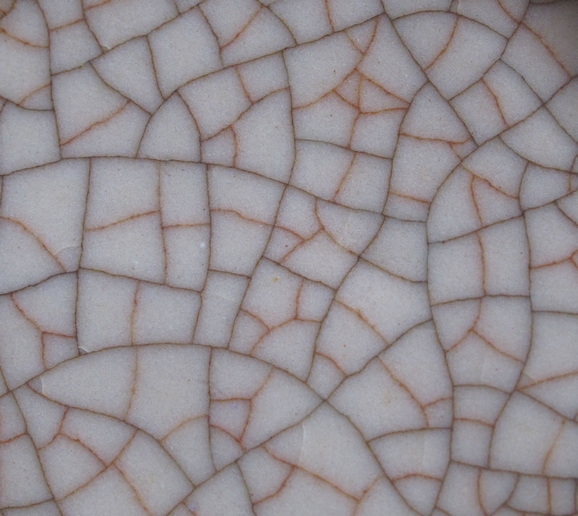 表釉 薄い、雑質ある。浅い灰白色(月白) 艶は暗淡、焼き温度が不足の感じ。 磁貫 紛乱して規則がない。磁貫の色ははっきりしない。 |