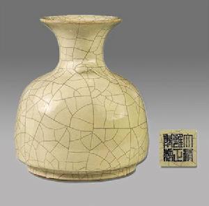 地土造形 鉄分が含む黒土、銅口鉄足現象 宋時代古典造形。角が丸いだが、端正が失わない。やや重厚 表釉 月白、米黄、天青、粉青。油性光沢、宋一代に最強の艶が誇る。 釉層が官窯ほど厚い。釉層に大小不均等な泡が集まる現象が見られる(聚沫攒珠) 磁貫 長い黒色磁貫の間に褐黄色の短い磁貫(鱔魚血)が密集、交織している(百及砕)。金糸鉄線現象、磁貫線が自然に延伸は曲度あり。 磁貫の色は上浅下深。氷裂文磁貫ものもある。 ![]() |