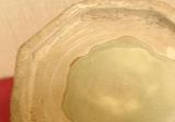 部分的な甘手:色絵器の年代現象 | 器の底部塗りの灰釉、色釉部分。大かまに砕文です。 | ||