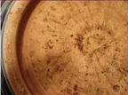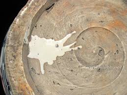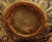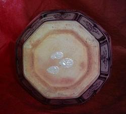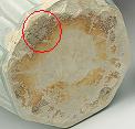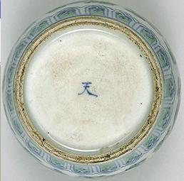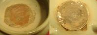 盤、碗、皿の内部中央底部に浅い丸い凹みがある現象です。丸い凹みの縁部はギザギザです。この現象の或る器の高台裏の削りも浅いです。圏足内縁部は弧状削りのものもあります。其の成因は景徳鎮伝統の轆轤成形に型押し整形で残した跡だと思います。明中期以降はこの現象はない。 なお、内部中央部の凹みやてんこ盛り現象に伴うことが多い。 |
