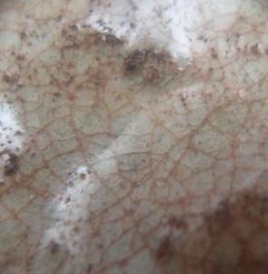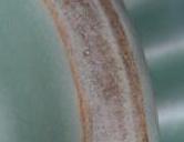 汝窯、早期龍泉窯 | 胡麻より小さいの針支え跡、汝官窯の鑑定のひとつ手がかりになります。 注意すべき点は、針支えの断面は汝官窯の灰色胎土とは成分が違い、白瓷土になります。 |