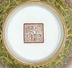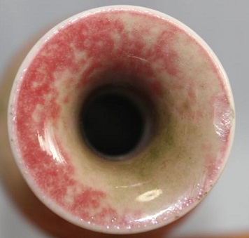 紅釉器は匣焼のため、圏足内部は閉じこまれていたため焼温度が低い。圏足内部出来上がりは紅色ではなく、やや米黄や林檎緑に呈する。 宣徳、朗窯紅器鑑定の手がかりです。 なお、当店の実物考査により、米黄色と林檎緑をひとつの器上で同事出現することもあります。あくまでも銅紅釉焼成時の条件によります。 |
