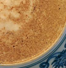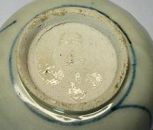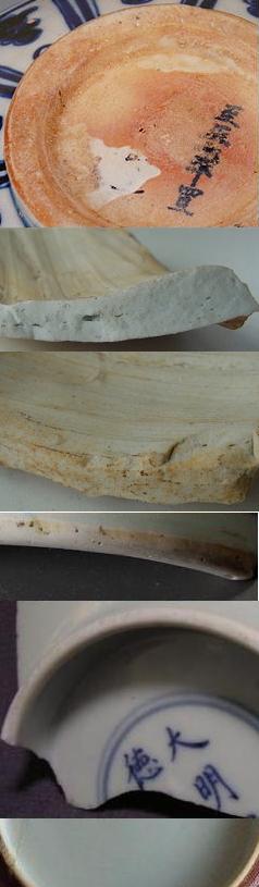 元末明初景徳鎮 | 元~明初の景徳鎮官窯用土(御土)に”麻倉土”と呼ばれる粘土を混ざっていました。器の底部の素地が不純物が見えます。 | |