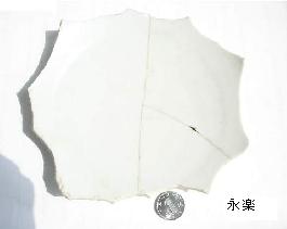 成分:風化雲母岩 産地:江西省景徳鎮高嶺山(旧称:饒州高粱山) 性質:粘土、質細白 焼成温度:1700℃ 麻倉山開掘尽くした後の新開土は高嶺山へ写した。明の磁器輸出と共に、”Kaolin”は世界に知られる。露胎処に火焼色がある。 |
