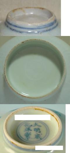 明中期、清三代 | 圏足断面は内向け弧形しています。明中期の場合は弧形度が大きい。 | |
