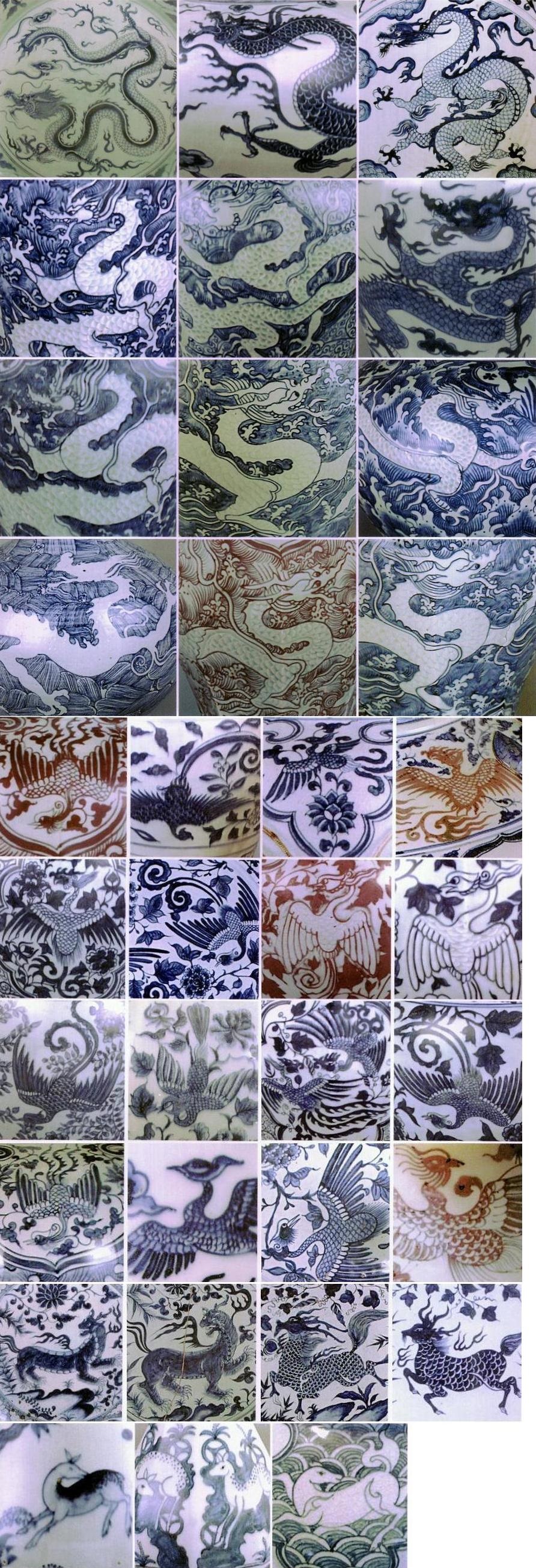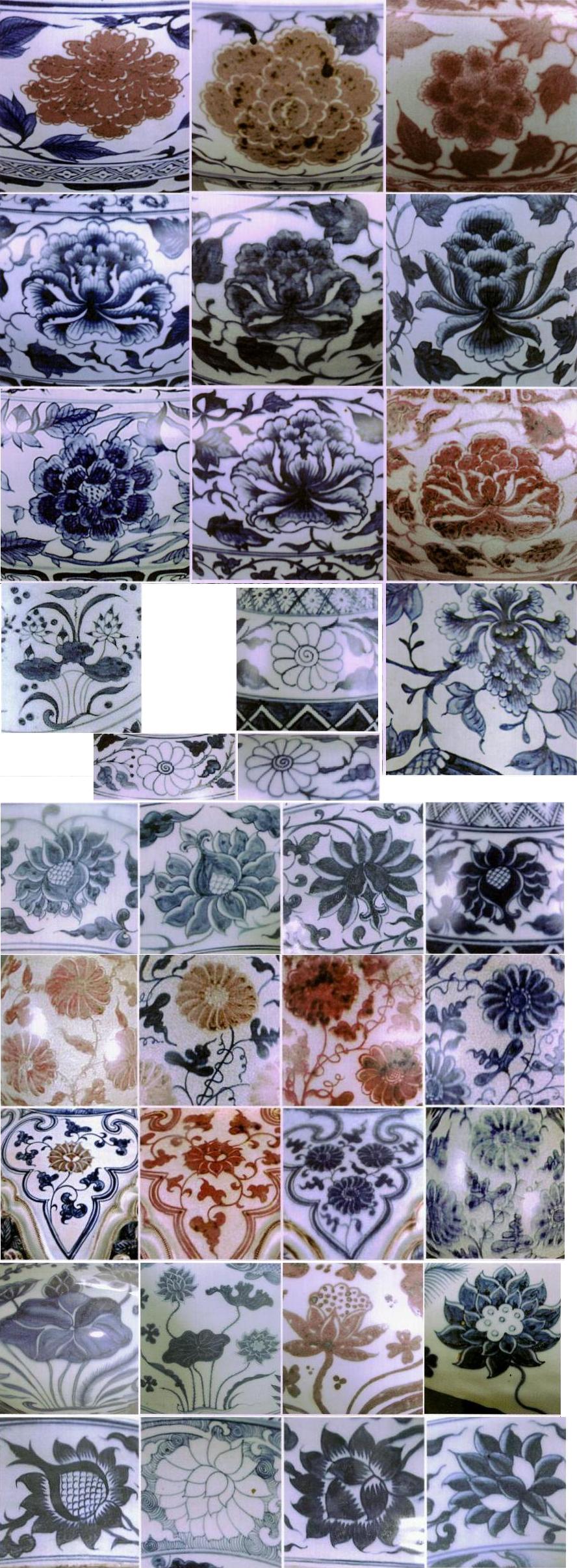| 元~明早期釉下彩(染付および釉里紅)器の焼成に於いて、焼成前に磁器表面に筆で絵付けすることは出来ました。このおかけで、豊富多彩な陶磁絵が出現しました。唐宋の場合は技法に制約されていたため、簡約的な文様装飾と比べると飛躍的な展開を注目されています。元~明早期の青花および釉里紅器の装飾文様は後、明清陶磁絵の基本パターンと源流になります。なお、発見されている遺品は数の限度がありますので、枚挙しやすいので、分類別のサンプル写真を下記添付致します。 | ||||