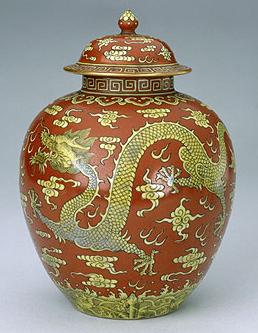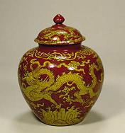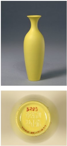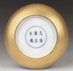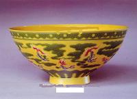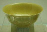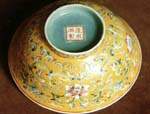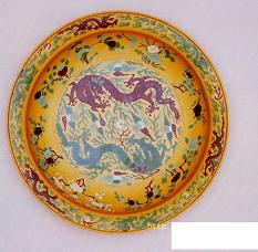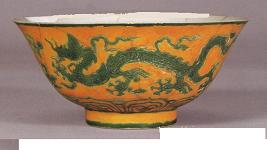 清の時代から、より繊細で明瞭な黄釉になります。黄釉器は皇族の特権とされています。(左写真参照)、その中鶏油のような厚実かつ落ち着いた感じの発色は最上品とされています。(非常に明るい黄色は写しの疑いがあります。) 清末から現代掛けて、軽い発色の黄釉も出た。 |