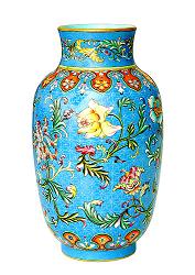 康熙年景徳鎮官窯(御厰窯)にて、西洋の無線七宝絵付け技術を磁器に絵付けを成功した。多彩な色絵磁器は出世した。当時は官製ですので、繊細に絵付けた小さいな器ばかりでした。応用した顔料は主に輸入エメラル彩ですから、色層は若干厚い、触る感じは凸凹です。なお、エメラル彩の欠点として同じ色の色調変化はほとんどないから、絵付けのセンスは七宝焼とほとんど変わらない。![]() ![]() 雍正年から、国産エメラル顔料は生産できたから、琺瑯彩器の生産も多くなりましたが、それほど上手ではない製品もありました。琺瑯彩技法は粉彩技法の形成に多く貢献した。雍正年琺瑯彩印章は”寿古”、”清香”などあります。 ![]() 乾隆年には、内府が景徳鎮から素磁胎を調達し、京の如意館文人を命じて琺瑯彩で絵製。宮内に窯を開き焼成した。品品皆精、底部に赤絵銘記念款、および”金成”、”旭映”、”先春”、”佳麗”印章あり。皇室鑑賞用および外国貴賓答礼用品でしたので、民間には知られていませんでしたが、イギリス女王へ一点が贈送されたため、初めて公開された。民国初期、故宮清室遺品整理時3百数点の蔵品は発見された。後半数以上は外部へ流失しました。 |