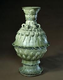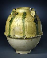 北朝黄釉緑彩蓮弁刻文四つ耳壺![]() |