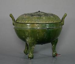 | 早期色釉として、漢の時代から多く焼かれました。以降歴代製品がありました。骨董価値のあるものは古陶時代のものだと思います(漢の時代~宋の時代まで、内唐三彩の一つの色釉としての緑釉器も価値が高い)。 漢の時代の緑釉は多く鉛の成分が含有し、現在発見されているものほぼ釉面には銀化膜帯びであります。 ![]() 近代発見されている漢緑釉器の中、キューカンバーグリーンとよばれるキュウイ皮のような光沢のよい深い緑色は人気上昇中です。割と銀化のすくないものは存在します。 |