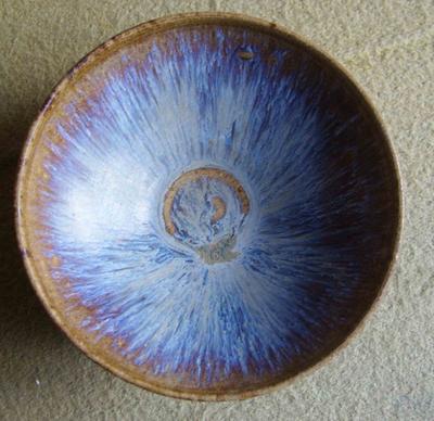 バラの紫:天青色の基調に霞を写し紫雲のような窯変色でした、鈞釉の最上手とされています。 (金)基本的窯変色は器に外部にある、内部には色変はすくない。 |