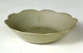 南宋龍泉窯初焼の青磁です。流れのない厚い釉は繊細な質の半透明青玉色がやや白く暈ける。中国は”粉青”と呼ばれ、日本では”砧青磁”と呼ばれた訳は、鎌倉時代に龍泉窯砧形青磁花入があったからでありました。茶人に珍重されます。 | |||||