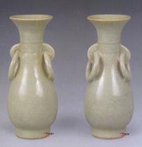 窯元は哥窯から名前をえった。南宋官窯のような「紫口鉄足」現象があります。南宋~元早期の作品は粉青、米黄、月白、油灰など呼ばれる色合いがあります。厚い釉にたくさんの荒い気泡が見られます。釉面の光沢はソフトで弱い、「酥光」と呼べれます。「金線鉄糸」と呼ばれる2色、2重氷裂磁貫入りの厚い青磁、その美術性の高さは公認されています 哥釉が存在した時期は非常に短期でしたので、遺品は極めてすくないので、台湾の故宮博物館に数点か収蔵されています。市場に出回る品はほとんど後代の写しだといわれます。 ![]() ![]() |