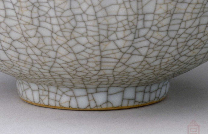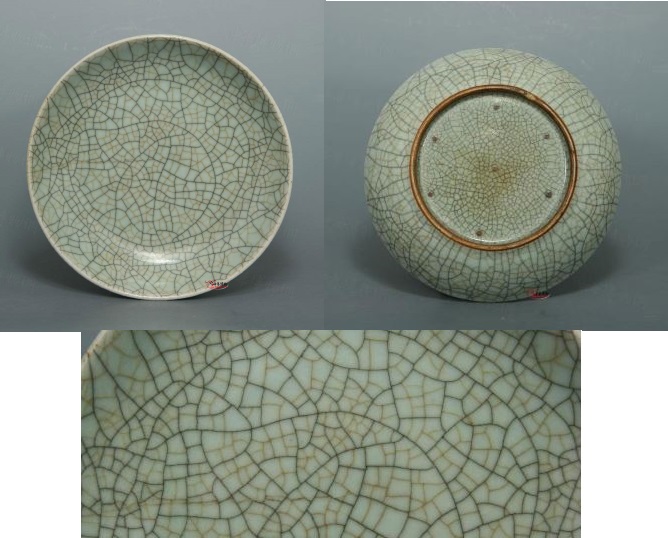 注:倣官窯の”官”は宋の時代の官窯を指すですが、それは北宋官窯か?または南宋官窯か?言葉上はは違いがないが、要するに、哥窯の金糸鉄線&銅口鉄足、尚且つ油性の強い光沢、この三つ哥窯の特徴が揃ってないものは、概に”官釉”と呼ばれます。或いは、”堆脂”と喩える官窯釉の玉質な半透明感とソフトな光沢のものを指す。その内、主に、南宋官窯を擬似したものが多い。