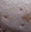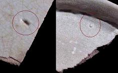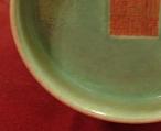 汝窯、早期龍泉窯 | 胡麻より小さいの針支え跡、汝官窯の鑑定のひとつ手がかりになります。 注意すべき点は、針支えの断面は汝官窯の灰色胎土とは成分が違い、白瓷土になります。 |