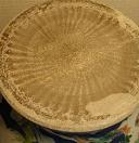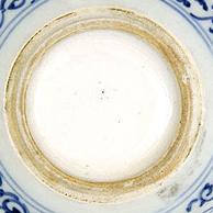 盤、碗、皿の内部中央底部に浅い丸い凹みがある現象です。丸い凹みの縁部はギザギザです。この現象の或る器の高台裏の削りも浅いです。圏足内縁部は弧状削りのものもあります。其の成因は景徳鎮伝統の轆轤成形に型押し整形で残した跡だと思います。明中期以降はこの現象はない。 なお、内部中央部の凹みやてんこ盛り現象に伴うことが多い。 |