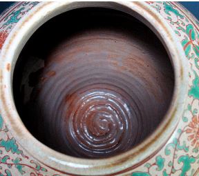 宋~元 | 壺はほぼ平底。底中央凹みを掘ることもあります。 匣詰焼の場合朱泥色細砂が付着する。 |