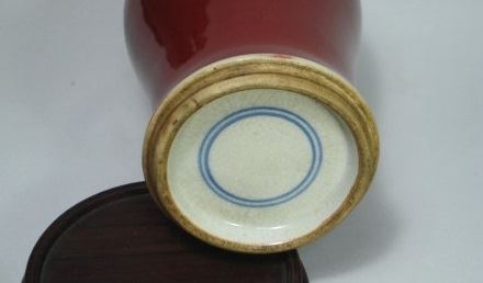 紅釉器は匣焼のため、圏足内部は閉じこまれていたため焼温度が低い。圏足内部出来上がりは紅色ではなく、やや米黄や林檎緑に呈する。 宣徳、朗窯紅器鑑定の手がかりです。 なお、当店の実物考査により、米黄色と林檎緑をひとつの器上で同事出現することもあります。あくまでも銅紅釉焼成時の条件によります。 |