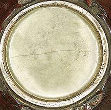 胎土は硬く焼いてないから、長年温度変化で膨張や収縮するため、表釉は繊細な磁貫ができる。砕文状長い磁貫の伴います、メロン皮の文様の感じです。土沁み、銀化や釉面落ちを伴うことがおおい。![]() |