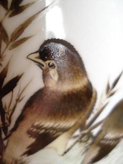 焼甘:注成形(洯胎器)は胎土に水分が多いため、焼成中表釉に細かい磁貫ができます。上彩を用いて隠すことが多い。 | 規則正しい網のような繊細な磁貫。窯出の現象ですから、年代と関係がございません。 なお、年代による網状細砕を甘手と勘違いやすいので要注意。 |
