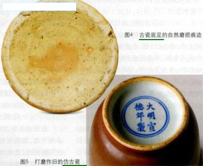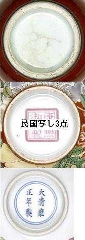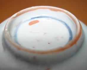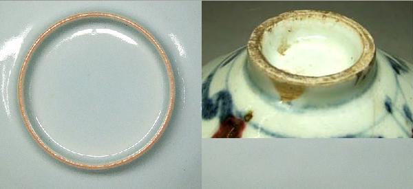清三代 | 清康熙、雍正、乾隆三代の景徳鎮磁器、特に官窯器の場合、底部の焼き紅色はほとんどなくなりましたが、一部の器の底縁部表釉と素地の結合部分に一線の紅色が呈し、先へ薄くなて行きます。 清中後期は高嶺土はなくなりましたので、この現象はありません。 写しの場合は一線の紅色がありますが、渡しはありません。 |