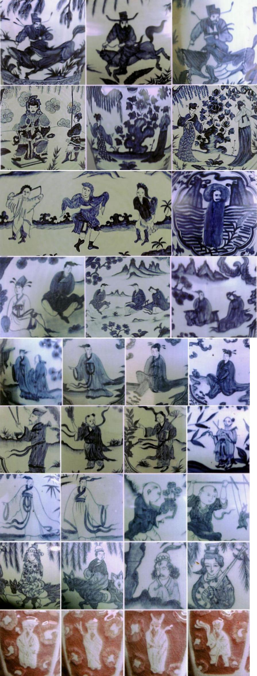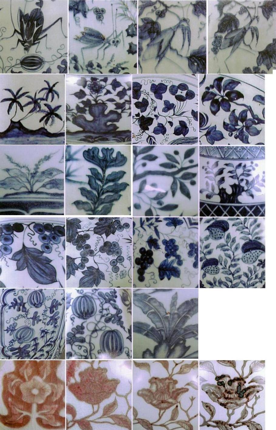 | 元~明早期釉下彩(染付および釉里紅)器の焼成に於いて、焼成前に磁器表面に筆で絵付けすることは出来ました。このおかけで、豊富多彩な陶磁絵が出現しました。唐宋の場合は技法に制約されていたため、簡約的な文様装飾と比べると飛躍的な展開を注目されています。元~明早期の青花および釉里紅器の装飾文様は後、明清陶磁絵の基本パターンと源流になります。なお、発見されている遺品は数の限度がありますので、枚挙しやすいので、分類別のサンプル写真を下記添付致します。 | ||||