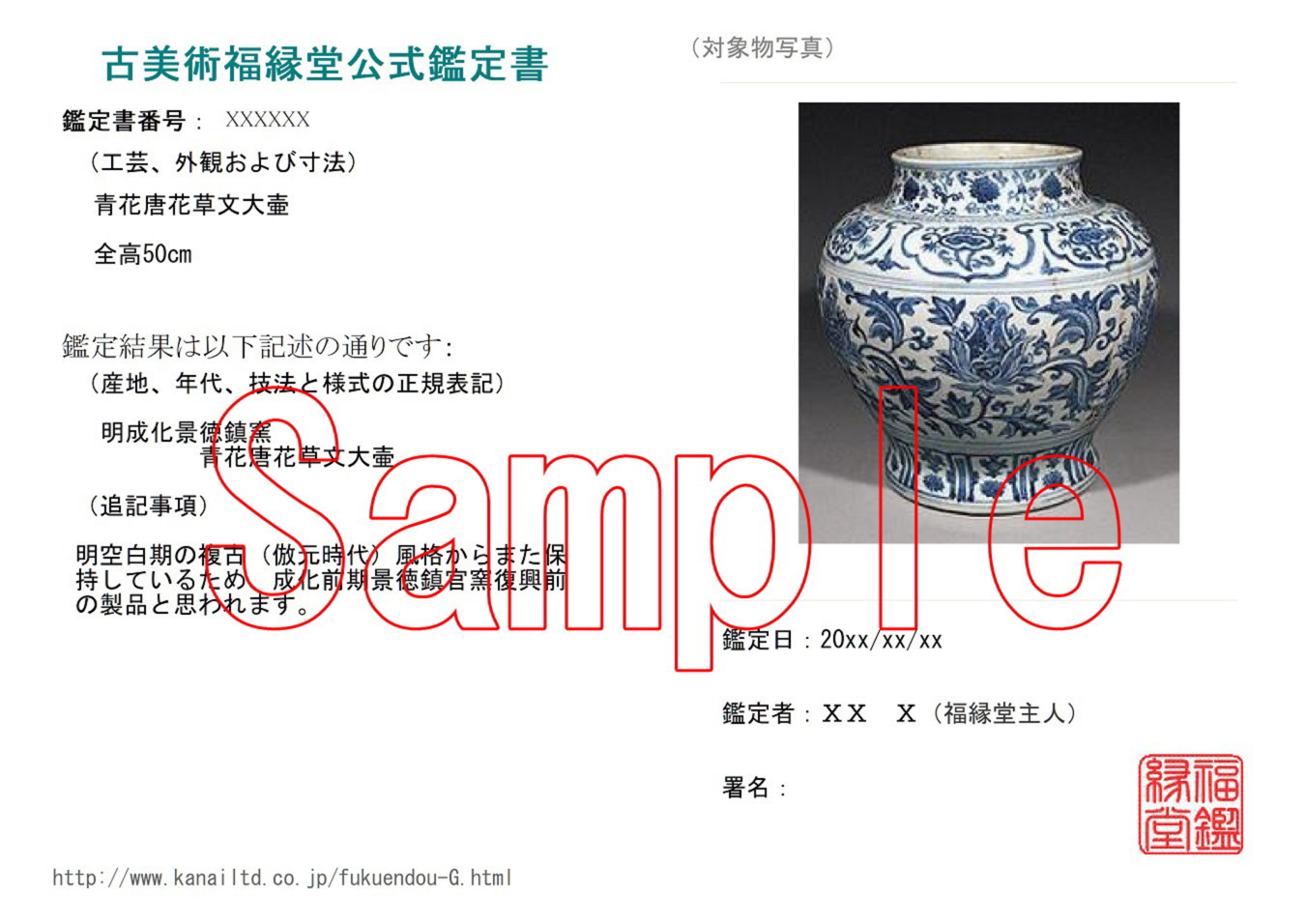 | 1.現代(明治以降)美術品や工芸品の場合、作家保証は六ヶ月とします。作品の状態についての保証は、下記取引条件範囲内で対応させていただきます。 2.骨董(明治前&清代前)美術品や工芸品の説明は入手先の説明を参考した上での当店の鑑定意見です。お客様の見解が異った場合は下記取引条件範囲内で対応させて頂きます。 |